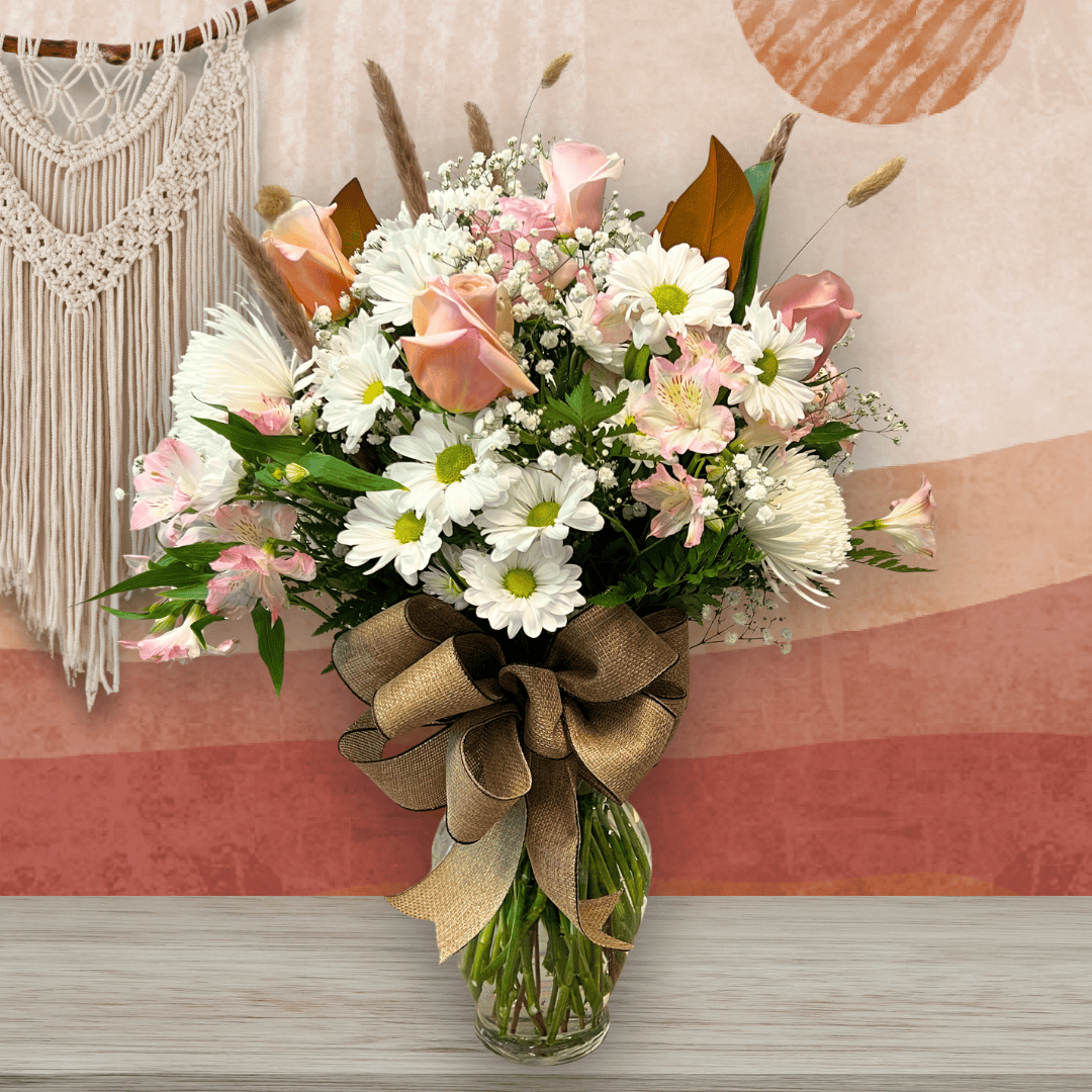 Our Blush and Burlap Bouquet is a stunning blend of blush Roses, cheerful white daisies, soft greenery, and rustic textures, all expertly arranged in a clear glass vase and tied with a burlap bow. This charming boho-inspired flower arrangement is perfect for birthdays, anniversaries, thank-you gifts, or simply bringing a smile to someone’s face this fall, handcrafted with love.