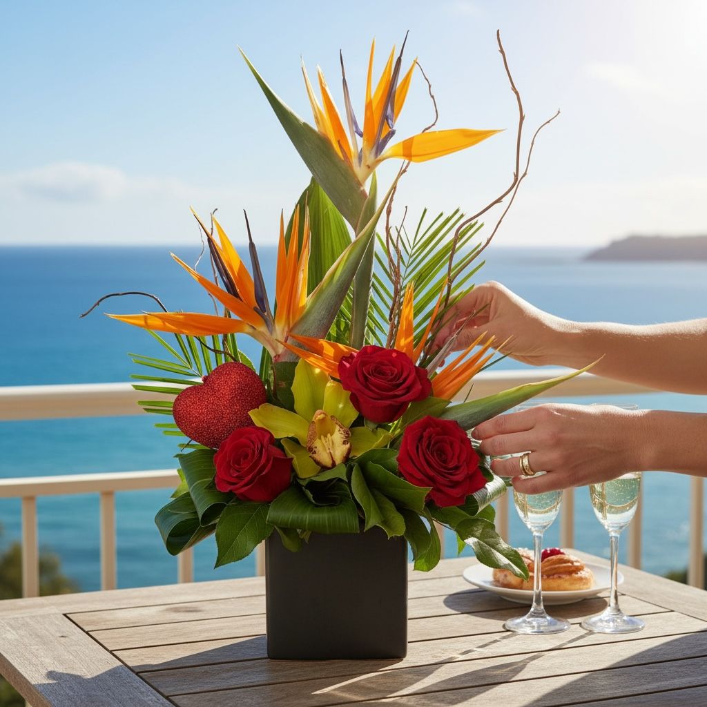 A tropical mix of birds of paradise, roses, an orchid and greenery that is bursting with playful romance. This floral design is giving those happy lovebird energies for Valentine’s Day.