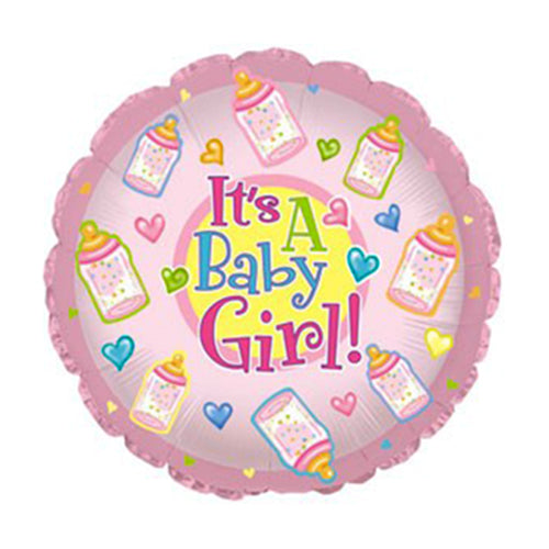 18" Pink It's A Girl Mylar Helium balloon with baby bottle print.