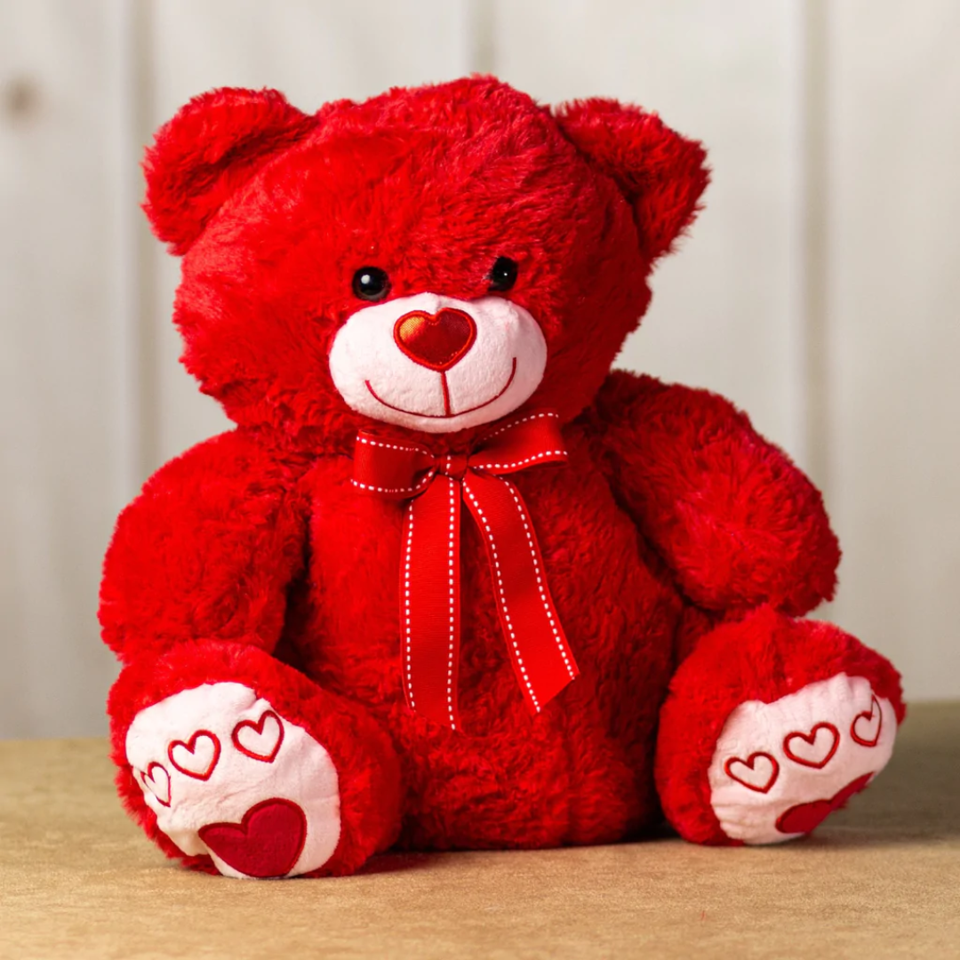 Red and a plushy teddy bear with a heart-shaped nose and feet.